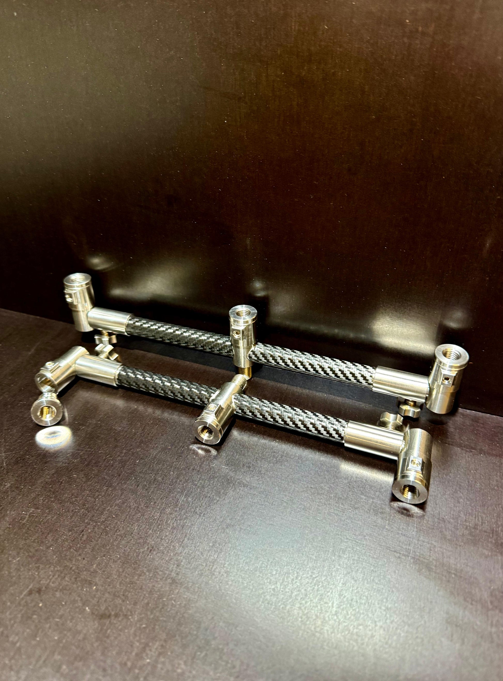 Robuste Buzzer Bars für 3 Ruten mit Carbon-Folie, Quick-Change-System und stufenloser Breitenverstellung. Für Rod Pods und Banksticks geeignet.